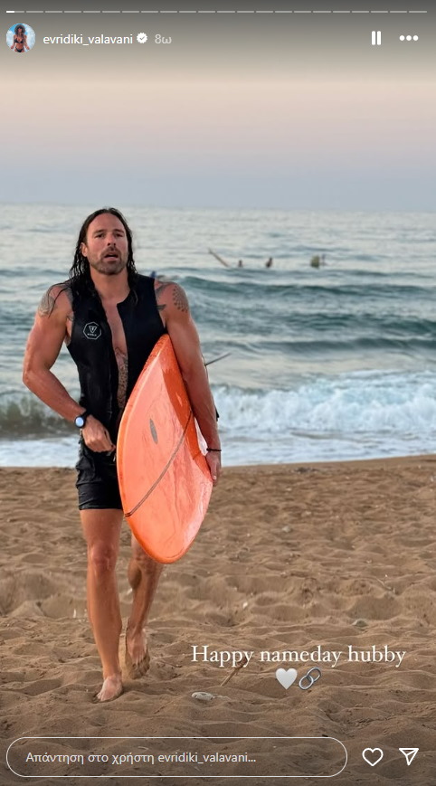Η Ευρυδίκη Βαλαβάνη, ανέβασε σε story, μία φωτογραφία του Γρηγόρη Μόργκαν που τον απεικονίζει τη στιγμή που βγαίνει από τη θάλασσα με μια σανίδα του surf.