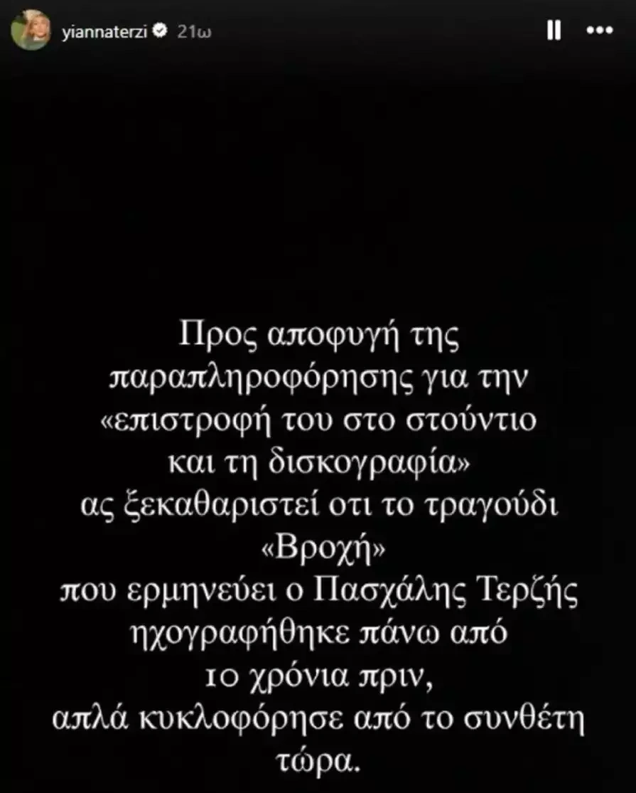 Με αυτό το story στο Instagram η Γιάννα Τερζή θέλει να ξεκαθαρίσει το τοπίο και να αποφύγει τις παρεξηγήσεις για το συγκεκριμένο τραγούδι που κυκλοφορεί πολύ τις τελευταίες ημέρες…