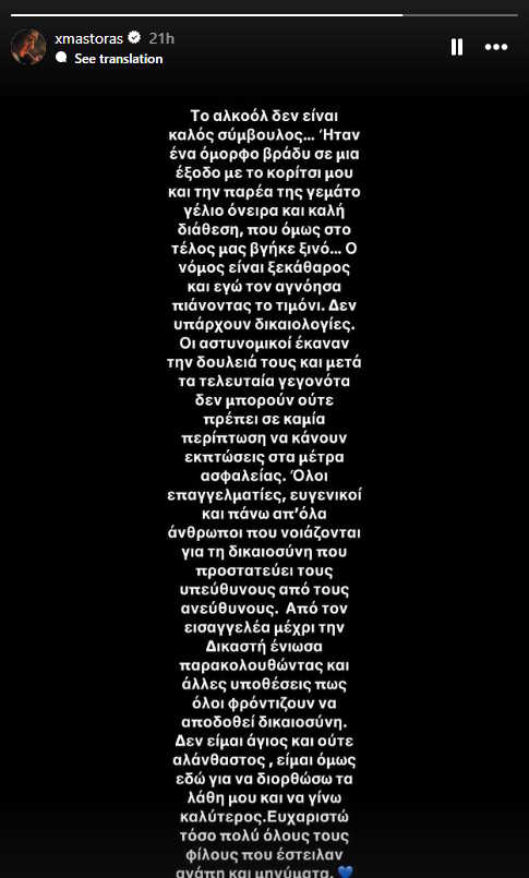 «Το αλκοόλ δεν είναι καλός σύμβουλος… Ήταν ένα όμορφο βράδυ σε μια έξοδο με το κορίτσι μου και την παρέα της γεμάτο γέλιο όνειρα και καλή διάθεση, που όμως στο τέλος μας βγήκε ξινό… Ο νόμος είναι ξεκάθαρος και εγώ τον αγνόησα πιάνοντας το τιμόνι. Δεν υπάρχουν δικαιολογίες. Οι αστυνομικοί έκαναν την δουλειά τους και μετά τα τελευταία γεγονότα δεν μπορούν ούτε πρέπει σε καμία περίπτωση να κάνουν εκπτώσεις στα μέτρα ασφαλείας».