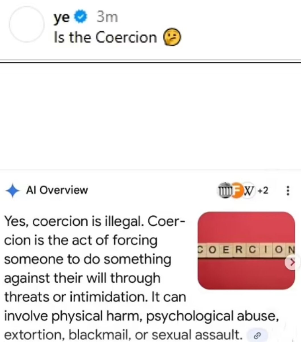 «Είναι εξαναγκασμός», έγραψε στη λεζάντα ενώ από κάτω πρόσθεσε μία φωτογραφία στην οποία δίνεται ο ορισμός του εξαναγκασμού.