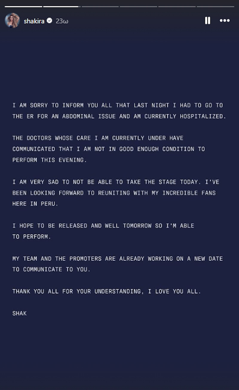 Η σταρ της λάτιν μουσικής, Σακίρα, πήρε εξιτήριο χθες το βράδυ (17.02.2025) από το νοσοκομείο της Λίμα στο Περού, όπου είχε κάνει εισαγωγή το Σάββατο λόγω κοιλιακού άλγους, σύμφωνα με σημερινά δημοσιεύματα του περουβιανού Τύπου.