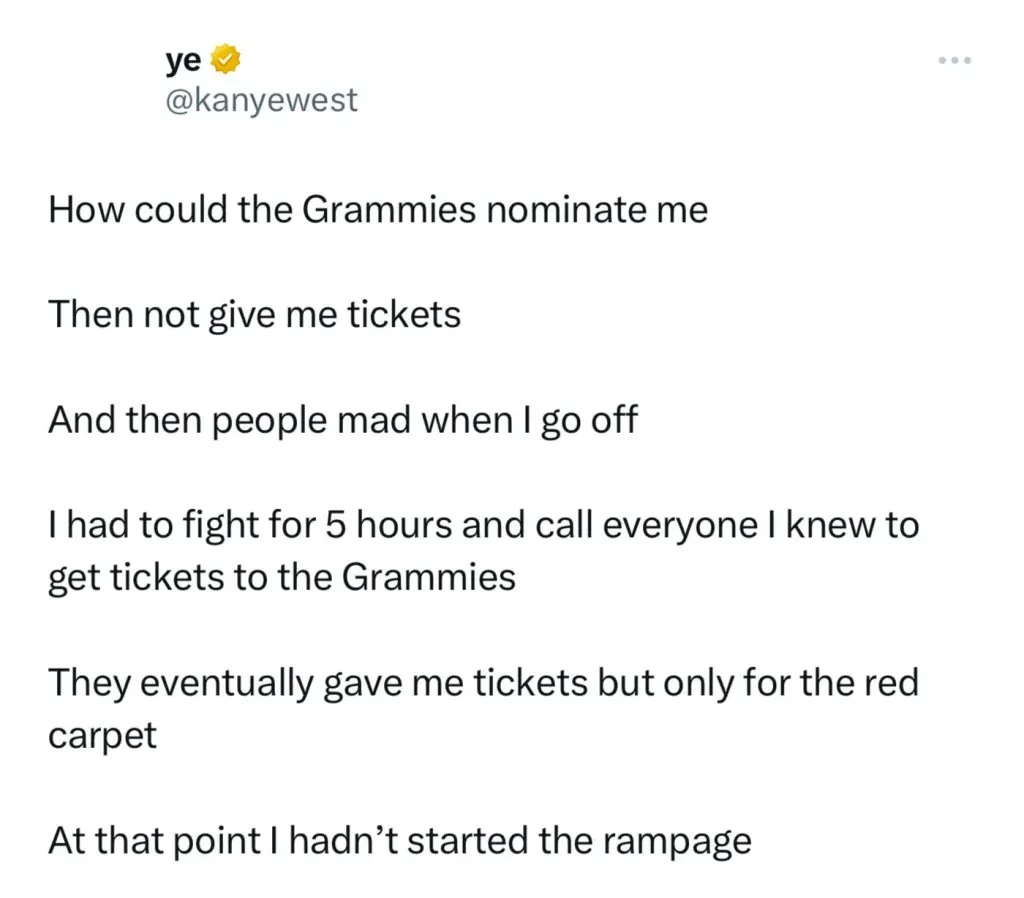 «Πώς θα μπορούσαν τα Grammies να με προτείνουν και μετά να μη μου δίνουν εισιτήρια και μετά να αναρωτιούνται γιατί εξοργίζομαι», έγραψε ο Kanye West μέσω του X το Σάββατο (15.02.2025) για την εκδήλωση των βραβείων, που συνοδευόταν από την Bianca Censori, στις 2 Φεβρουαρίου.