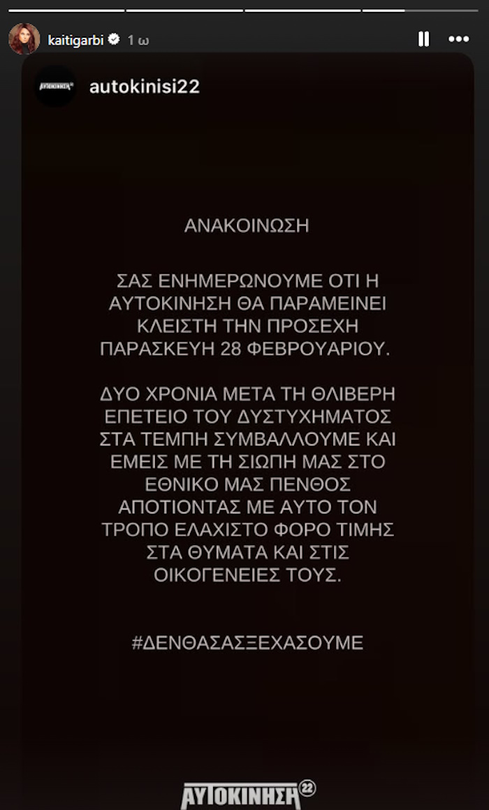 «Σας ενημερώνουμε ότι η Αυτοκίνηση θα παραμείνει κλειστή την προσεχή Παρασκευή. Δύο χρόνια μετά την θλιβερή επέτειο του δυστυχήματος στα Τέμπη, συμβάλλουμε και εμείς με την σιωπή μας στο εθνικό μας πένθος, αποτιόντας με αυτό τον τρόπο ελάχιστο φόρο τιμής στα θύματα και στις οικογένειές τους. Δεν θα σας ξεχάσουμε», έγραψε το νυχτερινό κέντρο στο οποίο εμφανίζεται η Καίτη Γαρμπή με τον Διονύση Σχοινά.