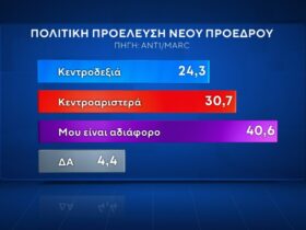 Πιο αναλυτικά, το 32,5% θα ψήφιζε ΝΔ και ακολουθούν ΣΥΡΙΖΑ με 17%, ΠΑΣΟΚ με 10,5%, ΚΚΕ με 7,5%, Ελληνική Λύση με 5%, Σπαρτιάτες με 3,% ενώ ΝΙΚΗ και Πλεύση Ελευθερίας θα έπαιρναν από 2,5%. Ούτε το ΜέΡΑ25 θα έμπαινε στη Βουλή, καθώς συγκεντρώνει 1,5%.