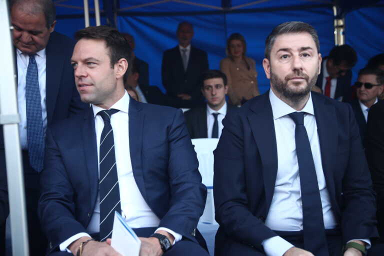 Ούτε ματιά δεν αντάλλαξαν ο Στέφανος Κασσελάκης και ο Νίκος Ανδρουλάκης, ενώ κάθονται δίπλα δίπλα, όπως ορίζει το πρωτόκολλο για τους αρχηγούς των κομμάτων, κατά τη στρατιωτική παρέλαση της Θεσσαλονίκης, για την εθνική επέτειο της 28ης Οκτωβρίου.