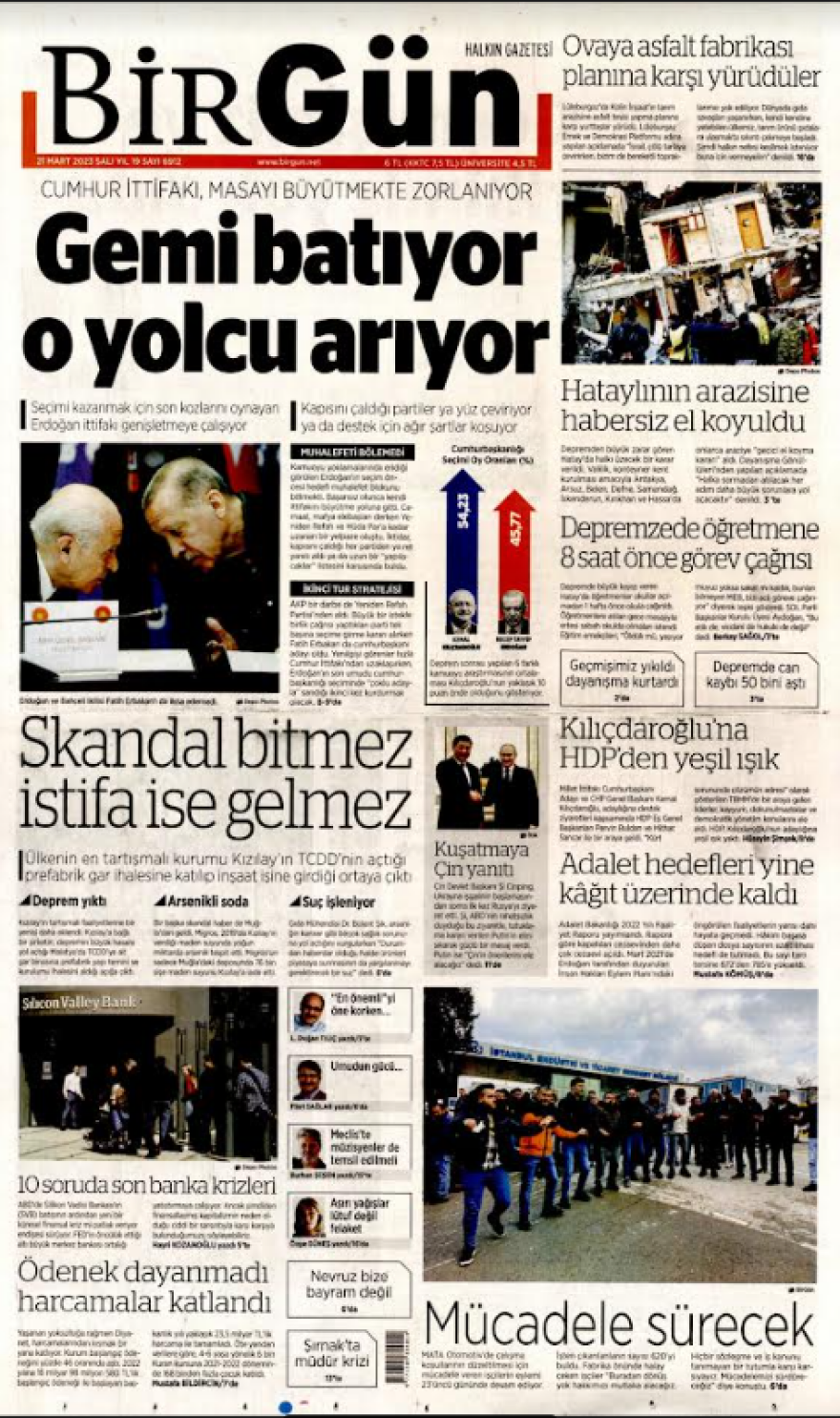 Στο πρωτοσέλιδο της εφημερίδας επίσης, παρουσιάζονται τα αποτελέσματα νέας δημοσκόπησης, σύμφωνα με την οποία ο επικεφαλής της συμμαχίας της αντιπολίτευσης Κεμάλ Κιλιντσάρογλου, διατηρεί προβάδισμα εννέα μονάδων από τον Τούρκο πρόεδρο (Κιλιντσάρογλου 54,23% και Ερντογάν 45,77%).