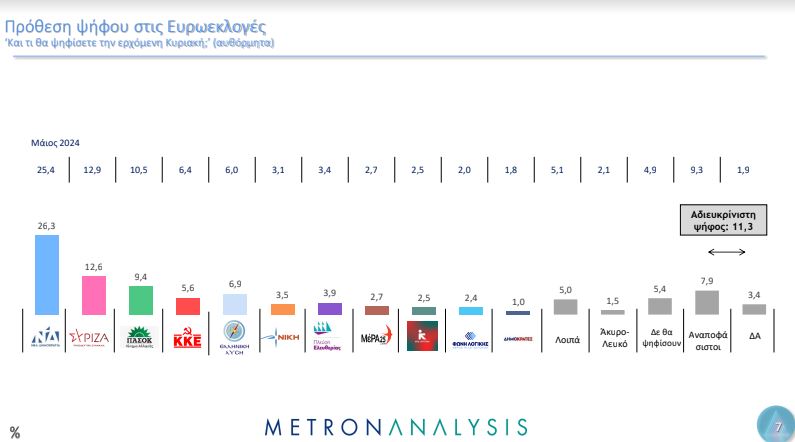 Αναλυτικά, στην πρόθεση ψήφου, η ΝΔ συγκεντρώνει 26,3%, ο ΣΥΡΙΖΑ 12,6%, το ΠΑΣΟΚ-ΚΙΝΑΛ 9,4%, το ΚΚΕ 5,6%, η Ελληνική Λύση 6,9%, η Νίκη 3,5%, η Πλεύση Ελευθερίας 3,9%, το ΜέΡΑ25 2,7%, η Νέα Αριστερά 2,5%, η Φωνή Λογικής 2,4%, οι Δημοκράτες 1%. Η αδιευκρίνιστη ψήφος στο 11,3%.