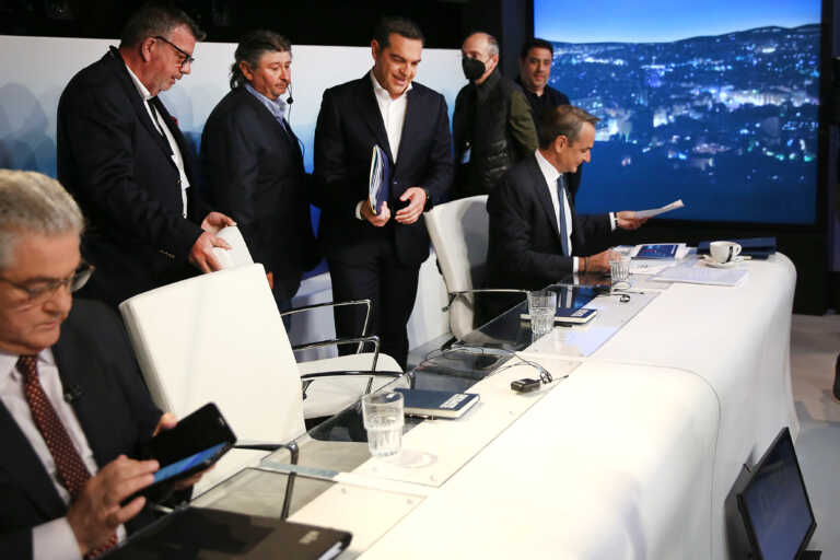 Μάρα Ζαχαρέα (STAR), Σία Κοσιώνη (ΣΚΑΪ), Γιώργος Παπαδάκης (ΑΝΤ1), Αντώνης Σρόιτερ (ALPHA), Παναγιώτης Στάθης (OPEN) και Ράνια Τζίμα (MEGA) βρέθηκαν ενώπιον του προέδρου της ΝΔ και πρωθυπουργού, Κυριάκου Μητσοτάκη, προέδρου του ΣΥΡΙΖΑ – Προοδευτική Συμμαχία, Αλέξη Τσίπρα, του προέδρου ΠΑΣΟΚ – ΚΙΝΑΛ, Νίκου Ανδρουλάκη, του Γ.Γ. της ΚΕ του ΚΚΕ, Δημήτρη Κουτσούμπα, του προέδρου της Ελληνικής Λύσης, Κυριάκου Βελόπουλου και του γραμματέα του ΜέΡΑ25, Γιάνη Βαρουφάκη.