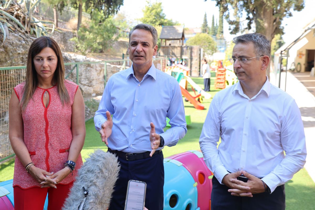 Ο πρωθυπουργός, συνοδευόμενος από την υπουργό Κοινωνικής Συνοχής και Οικογένειας, Σοφία Ζαχαράκη, ξεναγήθηκε στους χώρους του βρεφονηπιακού σταθμού και είχε την ευκαιρία να συνομιλήσει με τα παιδιά και τους εργαζόμενους του σταθμού.
