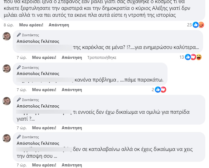 Αρχικά ο Απόστολος Γκλέτσος απάντησε σε σχόλιο χρήστη, που έκανε λόγο για «αριστερούς της καρέκλας» με τον πρώην δήμαρχο Στυλίδας να απαντά «της καρέκλας σε μένα?!?….για ενημερώσου καλύτερα…».