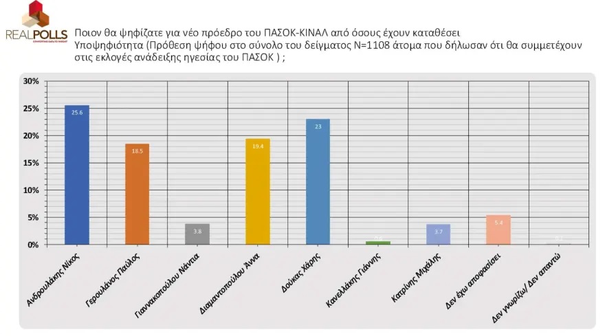 Με βάση την δημοσκόπηση που διεξήχθη έναν μήνα πριν τις πρώτες κάλπες και λίγες ημέρες μετά τον εοαρτασμό των 50χρονων του ΠΑΣΟΚ στο Ζάππειο, ο Νίκος Ανδρουλάκης και ο Χάρης Δούκας, καταλαμβάνουν τις δύο πρώτες θέσεις, με ποσοστά 25,6% και 23% αντίστοιχα στην απλή πρόθεση ψήφου (Πίνακας Ι), και 26,4% με 24,6% μετά την κατανομή της αδιευκρίνιστης ψήφου (εκτίμηση αποτελέσματος, Πίνακας ΙΙ).