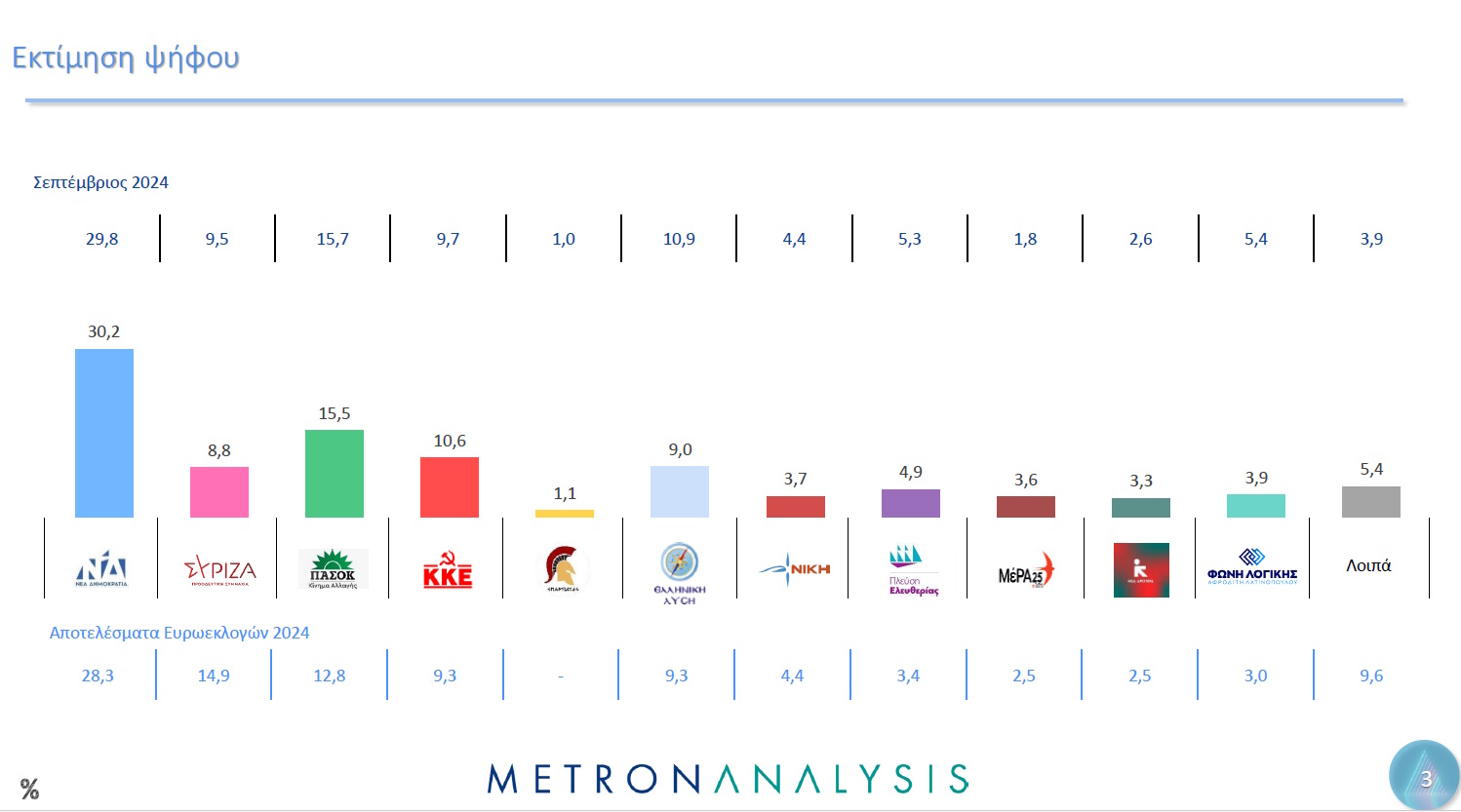 Σύμφωνα με τα αποτελέσματα της δημοσκόπησης της Metron Analysis, στην κάρτα για την εκτίμηση ψήφου, η ΝΔ εμφανίζεται να συγκεντρώνει το 30,2%, το ΠΑΣΟΚ βρίσκεται (σταθερά πια) στη δεύτερη θέση με ποσοστό 15,5% ενώ ο ΣΥΡΙΖΑ εμφανίζεται πέμπτο κόμμα με ποσοστό 8,8%