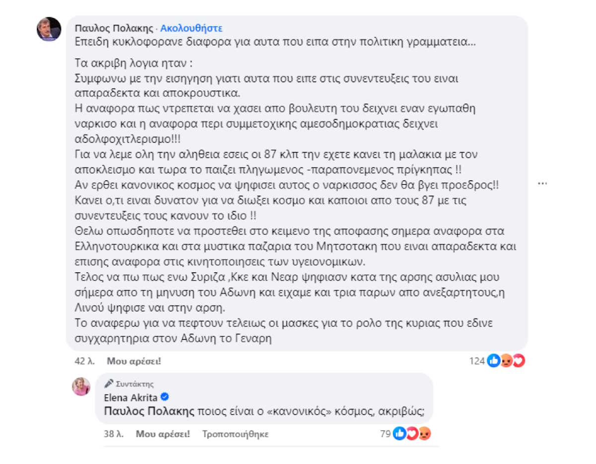 «Αλήθεια το ξεστόμισες αυτό, Παύλο Πολάκη;», ανέφερε αρχικά η Έλενα Ακρίτα στην ανάρτησή της.