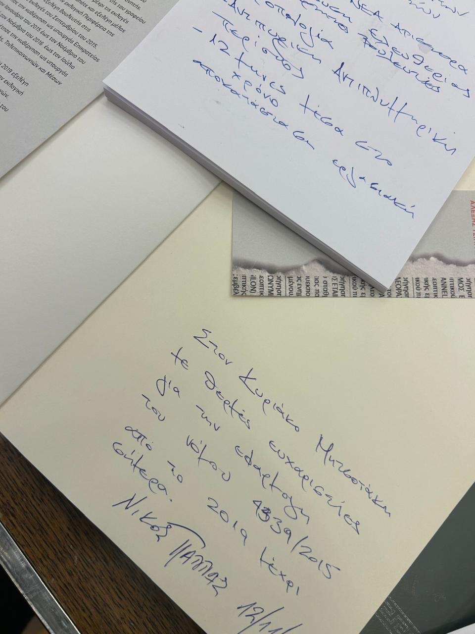 Μάλιστα, όπως φαίνεται και στην παρακάτω φωτογραφία, μέσα στο βιβλίο είχε και μία αφιέρωση – φαρμάκι που έγραψε ο κ. Παππάς για τον πρωθυπουργό, η οποία ανέφερε χαρακτηριστικά: «Στον Κυριάκο Μητσοτάκη με θερμές ευχαριστίες για την εφαρμογή του νόμου 4339/2015 από το 2019 μέχρι σήμερα. Νίκος Παππάς».