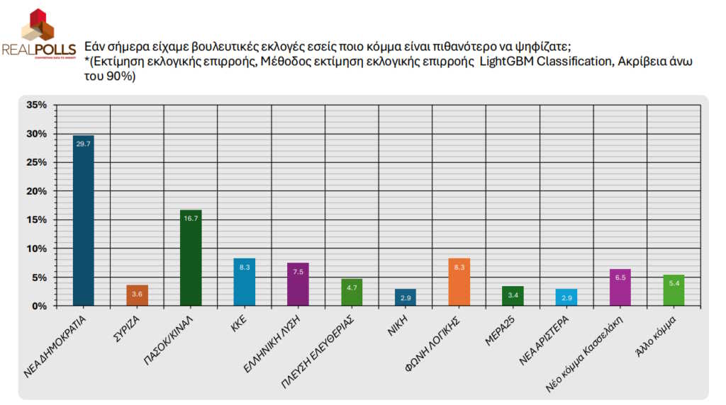 Στη δημοσκόπηση της Real Polls για τον Alpha, στην εκτίμηση εκλογικής επιρροής, η ΝΔ προηγείται με 29,7% (26,5-32,5) και ακολουθεί το ΠΑΣΟΚ – Κίνημα Αλλαγής με 16,7% (14,2-19,2).