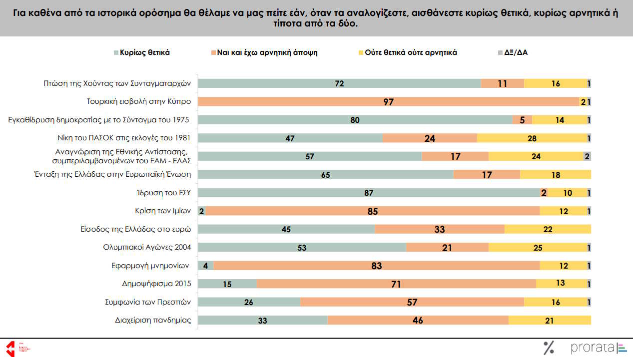 Θετικά συναισθήματα οι πολίτες τρέφουν με 87% για την ίδρυση του ΕΣΥ, ακολουθεί με 80% η Εγκαθίδρυση της Δημοκρατίας με το Σύνταγμα του 1975 και τρίτη με 72% η πτώση της Χούντας των Συνταγματαρχών. Ακολουθούν η Ένταξη της Ελλάδας στην Ευρωπαϊκή Ένωση και Αναγνώριση της Εθνικής Αντίστασης, συμπεριλαμβανομένων του ΕΑΜ – ΕΛΑΣ.