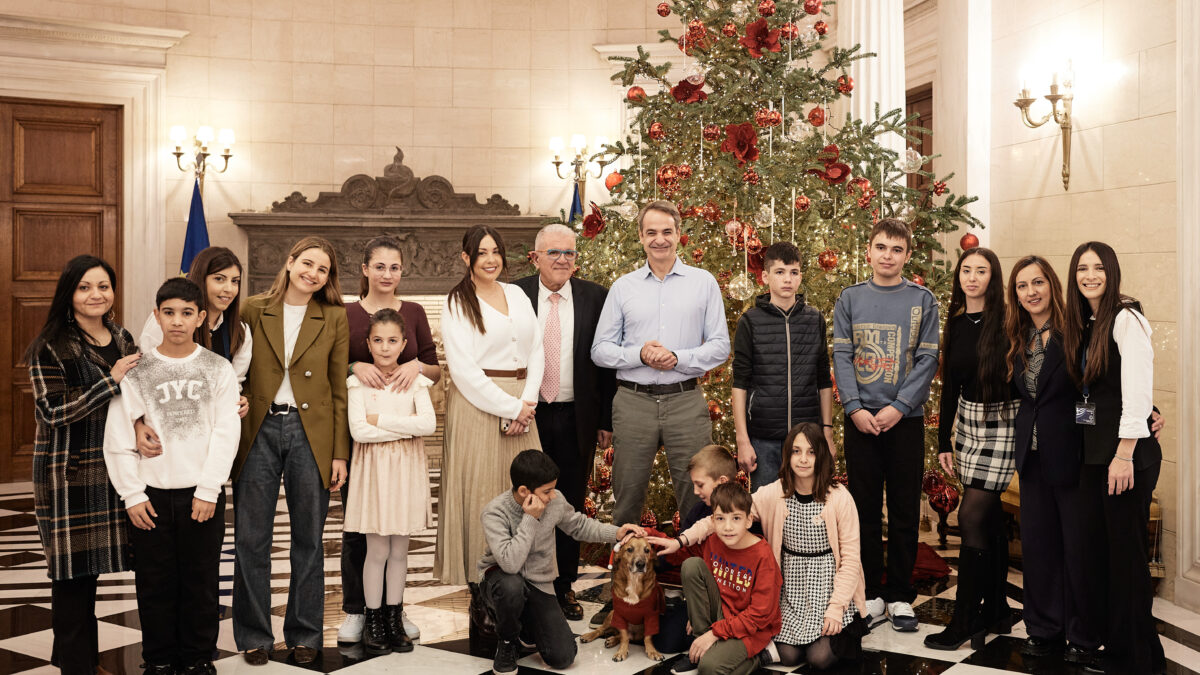 Ευχές και δώρα με κορίτσια και αγόρια που φιλοξενούνται στο Παράρτημα Προστασίας Παιδιού και Νέων Αχαΐας – Σκαγιοπούλειο αντάλλαξε ο πρωθυπουργός Κυριάκος Μητσοτάκης, μαζί με την κόρη του Δάφνη στο Μέγαρο Μαξίμου.