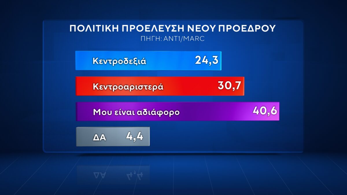 Αδιάφορος είναι ο πολιτικός χώρος από τον οποίο θα προέρχεται ο επόμενος Πρόεδρος της Δημοκρατίας, στο 40,6% των ερωτηθέντων, στη δημοσκόπηση της Marc που έγινε για λογαριασμό του ΑΝΤ1.