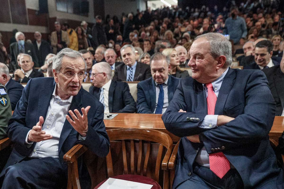 Κώστας Καραμανλής και Αντώνης Σαμαράς έδωσαν το παρών τη Δευτέρα (20.01.2025) στην παρουσίαση του βιβλίου «Για μία νέα στρατηγική απέναντι στην Τουρκία – Πώς θα ακυρώσουμε τη «Γαλάζια Πατρίδα», του πρώην υφυπουργού Εξωτερικών, Γιάννη Βαληνάκη στο Πολεμικό Μουσείο.