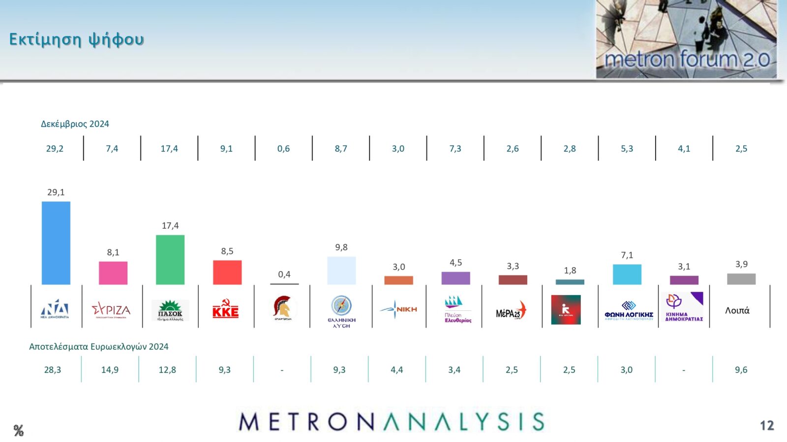 Συγκεκριμένα σύμφωνα με τη δημοσκόπηση της Metron Analysis στην εκτίμηση ψήφου τα ποσοστά των κομμάτων είναι τα ακόλουθα: