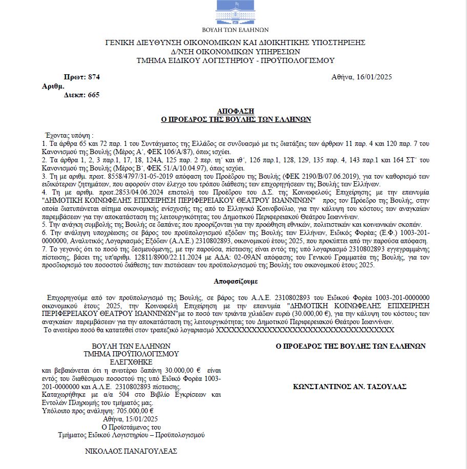 -Επιχορήγηση 125.000 ευρώ προς την Ιερά Μητρόπολη Ιωαννίνων, -Επιχορήγηση 30.000 ευρώ προς τη Δημοτική Κοινωφελή Επιχείρηση Περιφερειακού Θεάτρου Ιωαννίνων -Επιχορήγηση 5.000 ευρώ προς το σωματείο “Ηπειρωτική Εστία” -και τη δέσμευση 815.685 ευρώ από τον Ειδικό Λογαριασμό που διαχειρίζεται η Υπηρεσία Διάθεσης Ευρωπαϊκών και Λοιπών Πιστώσεων της Βουλής για την κατασκευή του Στρατιωτικού Ιστορικού Μουσείου Κόνιτσας σε συνέχεια σχετικής απόφασης της Διάσκεψης των Προέδρων.
