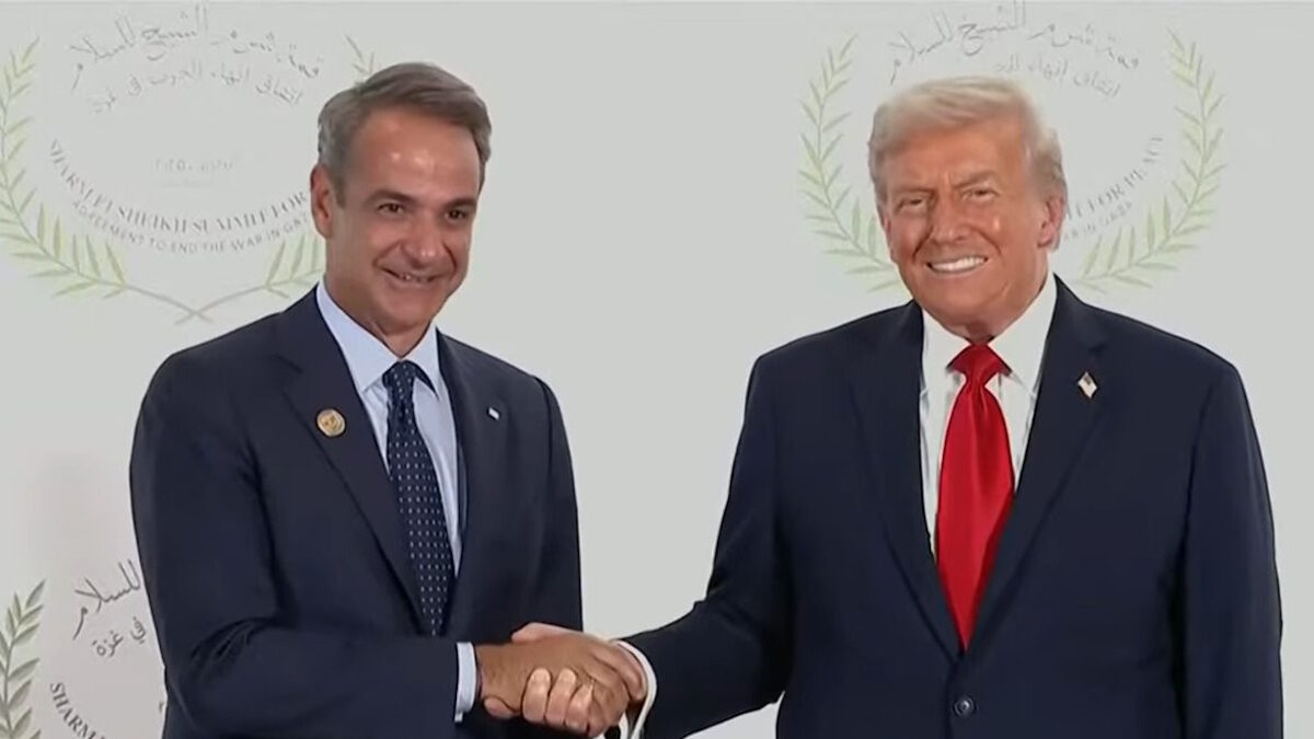 Ο πρωθυπουργός, Κυριάκος Μητσοτάκης ανταλλάσσει χειραψία με τον Αμερικανό Πρόεδρο, Ντόναλντ Τραμπ στη Σύνοδο Κορυφής του Σαρμ Ελ Σέιχ για την ειρήνευση στη Λωρίδα της Γάζας / REUTERS / Φωτογραφία Suzanne Plunkett
