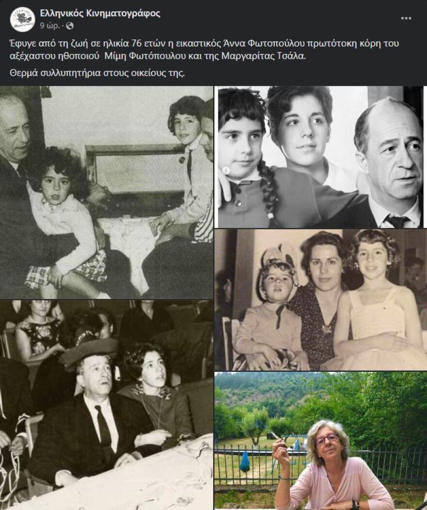 Έφυγε από τη ζωή σε ηλικία 76 ετών η εικαστικός Άννα Φωτοπούλου πρωτότοκη κόρη του αξέχαστου ηθοποιού Μίμη Φωτόπουλου και της Μαργαρίτας Τσάλα. Θερμά συλλυπητήρια στους οικείους της.