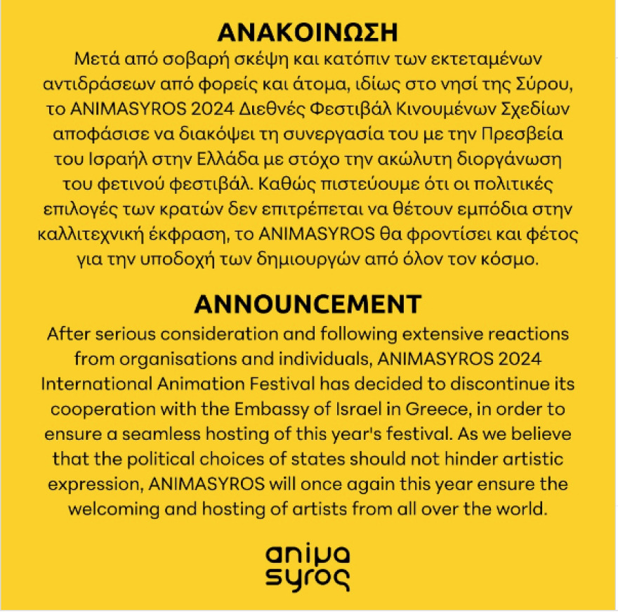 Η διοίκηση του Animasyros δημοσιοποίησε την διακοπή της συνεργασίας με την ισραηλινή πρεσβεία, χθες, με την εξής ανακοίνωση: «Μετά από σοβαρή σκέψη και κατόπιν εκτεταμένων αντιδράσεων από φορείς και άτομα, ιδίως στο νησί της Σύρου, το ANIMASYROS 2024 αποφάσισε να διακόψει τη συνεργασία του με την Πρεσβεία του Ισραήλ στην Ελλάδα με στόχο την ακώλυτη διοργάνωση του φετινού φεστιβάλ. Καθώς πιστεύουμε ότι οι πολιτικές επιλογές των κρατών δεν επιτρέπεται να θέτουν εμπόδια στην καλλιτεχνική έκφραση, το ANIMASYROS θα φροντίσει και φέτος για την υποδοχή των δημιουργών απ’ όλο τον κόσμο».