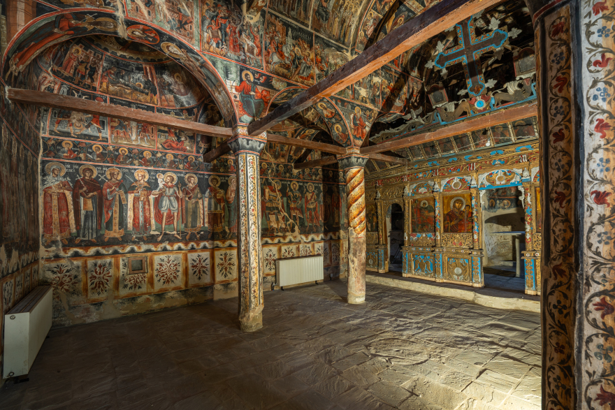 Ο πλούσιος τοιχογραφικός διάκοσμος του ναού αναπτύσσεται σε ζώνες, όπως συνηθιζόταν την εποχή αυτή, με τις παραστάσεις να απλώνονται στις καμάρες, στις τοξοστοιχίες, στα φουρνικά, ακόμη και στους κίονες και στους ξύλινους ελκυστήρες του ναού.