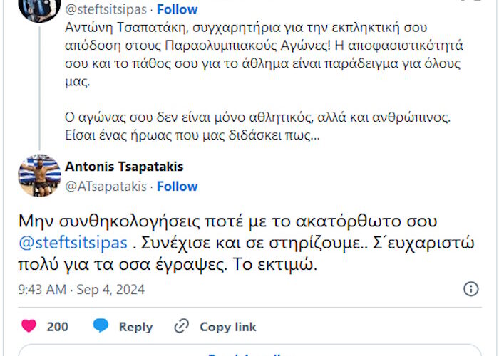 Ο Στέφανος Τσιτσιπάς αποθέωσε τον Αντώνη Τσαπατάκη και ο Παραολυμπιονίκης του έστειλε μήνυμα στήριξης