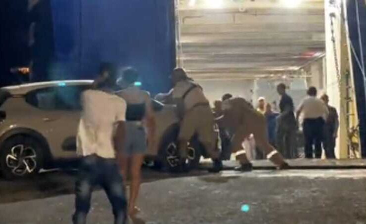 Επιβάτες προσπαθούν να σπρώξουν αυτοκίνητο στο πλοίο που δεν μπορούσε να δέσει στο λιμάνι την Άνδρου λόγω κακοκαιρίας