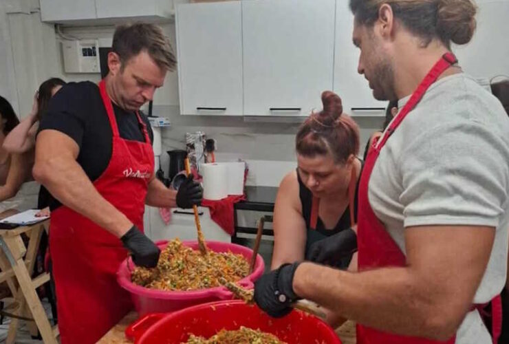 Ο Στέφανος Κασσελάκης με κόκκινη ποδιά για εθελοντική εργασία στην κουζίνα του «Humanity Greece» στο Μεταξουργείο