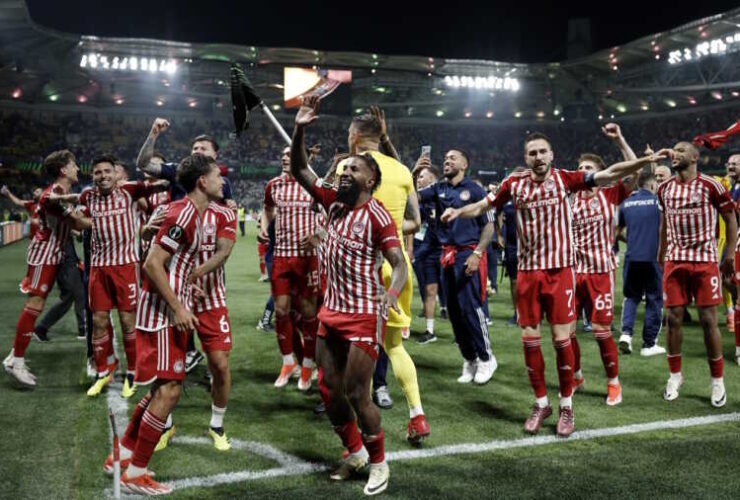 Ολυμπιακός: Η «έκρηξη» χαράς των ποδοσφαιριστών και οι πανηγυρισμοί με τη λήξη του τελικού του Conference League