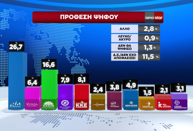 Δημοσκόπηση GPO: Προβάδισμα για τη ΝΔ, πτώση για το ΠΑΣΟΚ